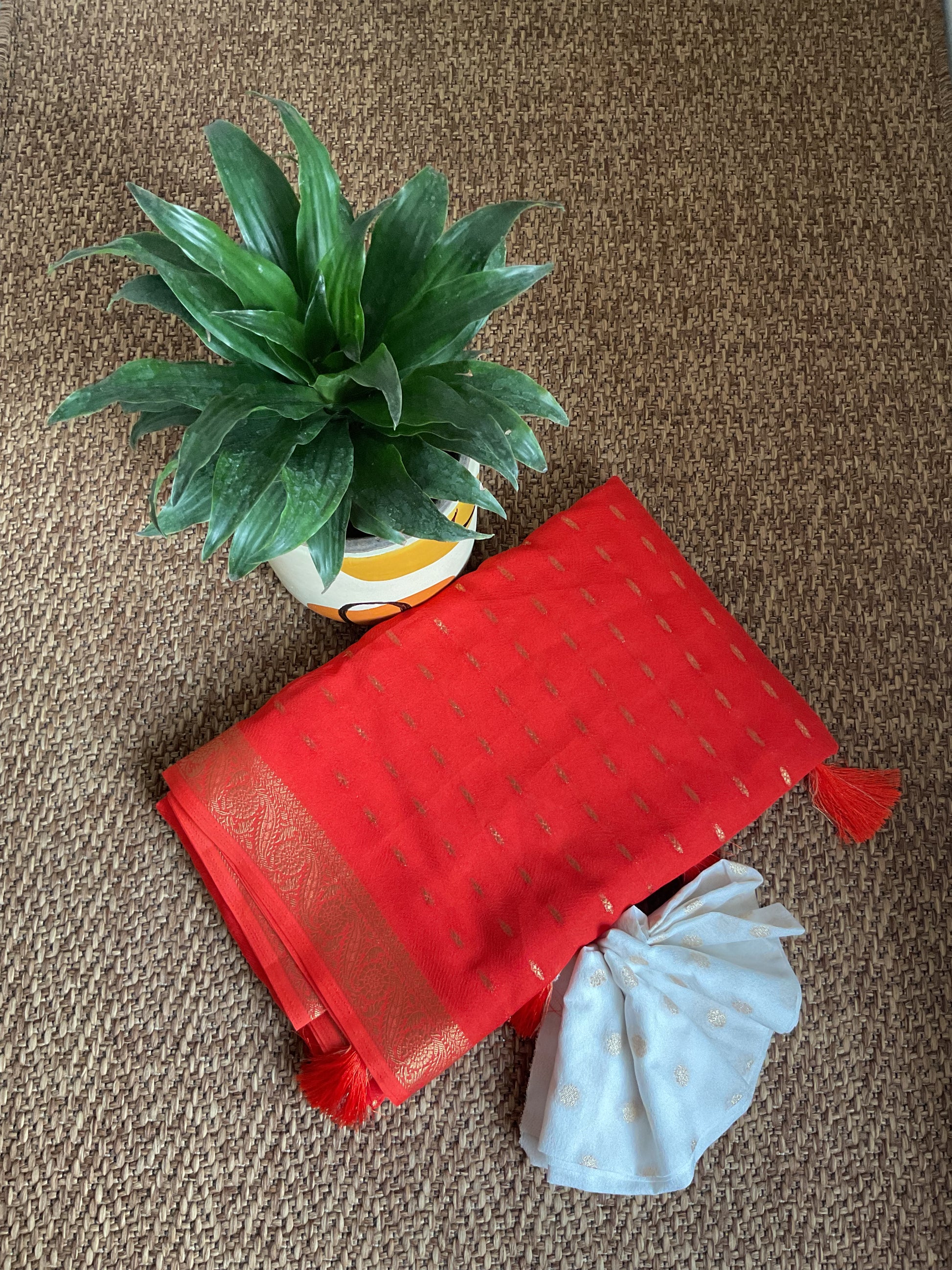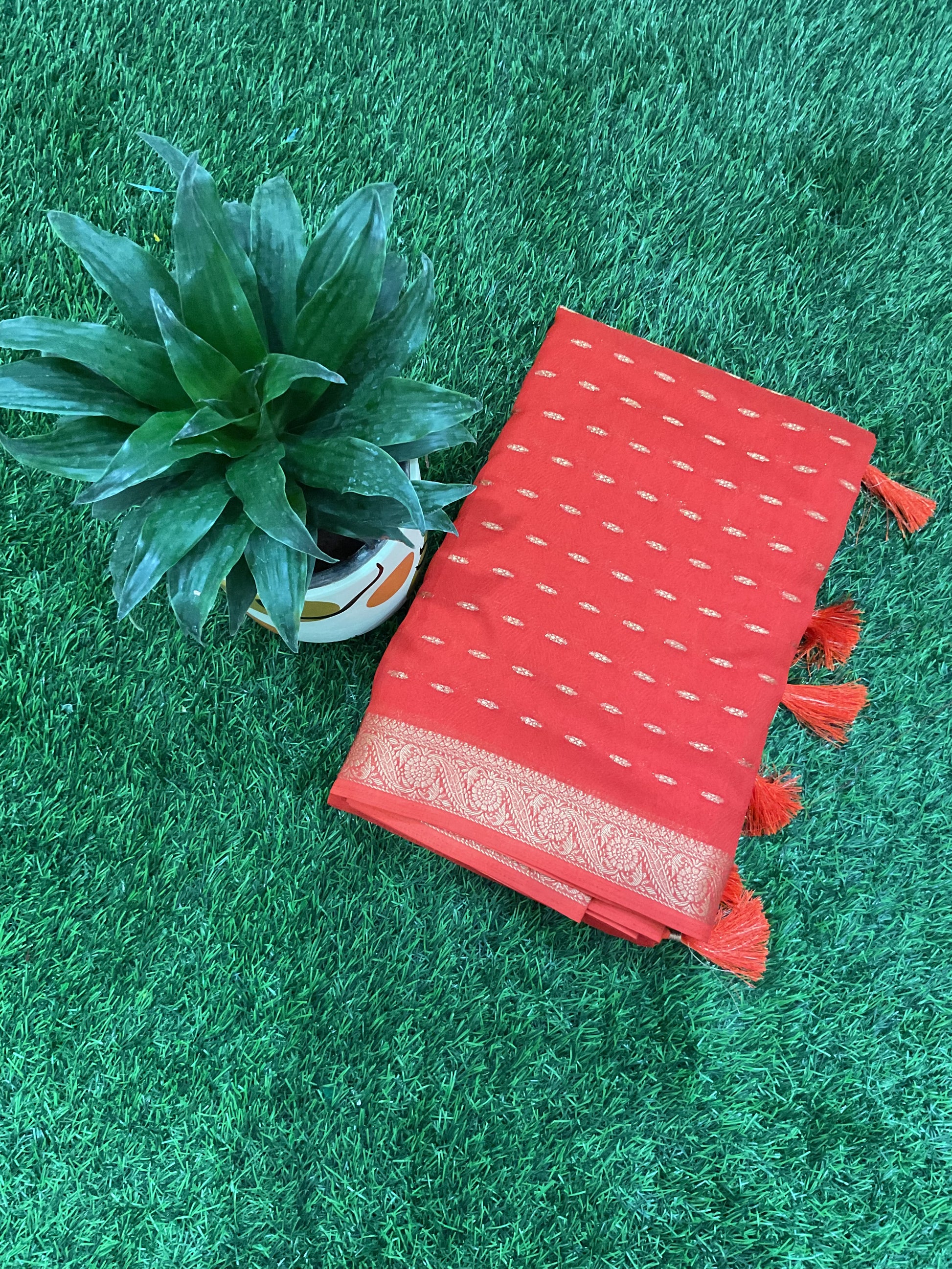 Description:A timeless red saree that speaks elegance in every fold. Adorned with delicate gold zari buttas all over and finished with a rich woven zari border, this saree is perfect for festive celebrations, poojas, weddings and special occasions.The subtle sheen with tassel detailing adds grace while keeping the look classy and traditional.When in doubt, choose orange❤️